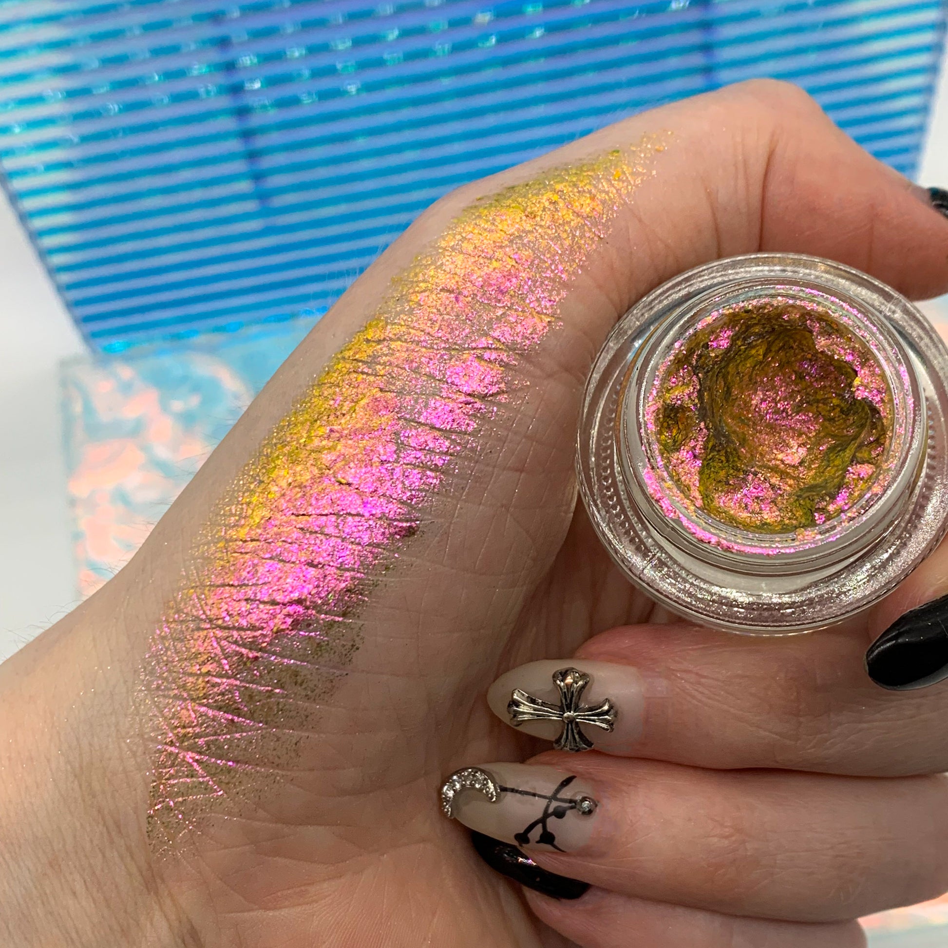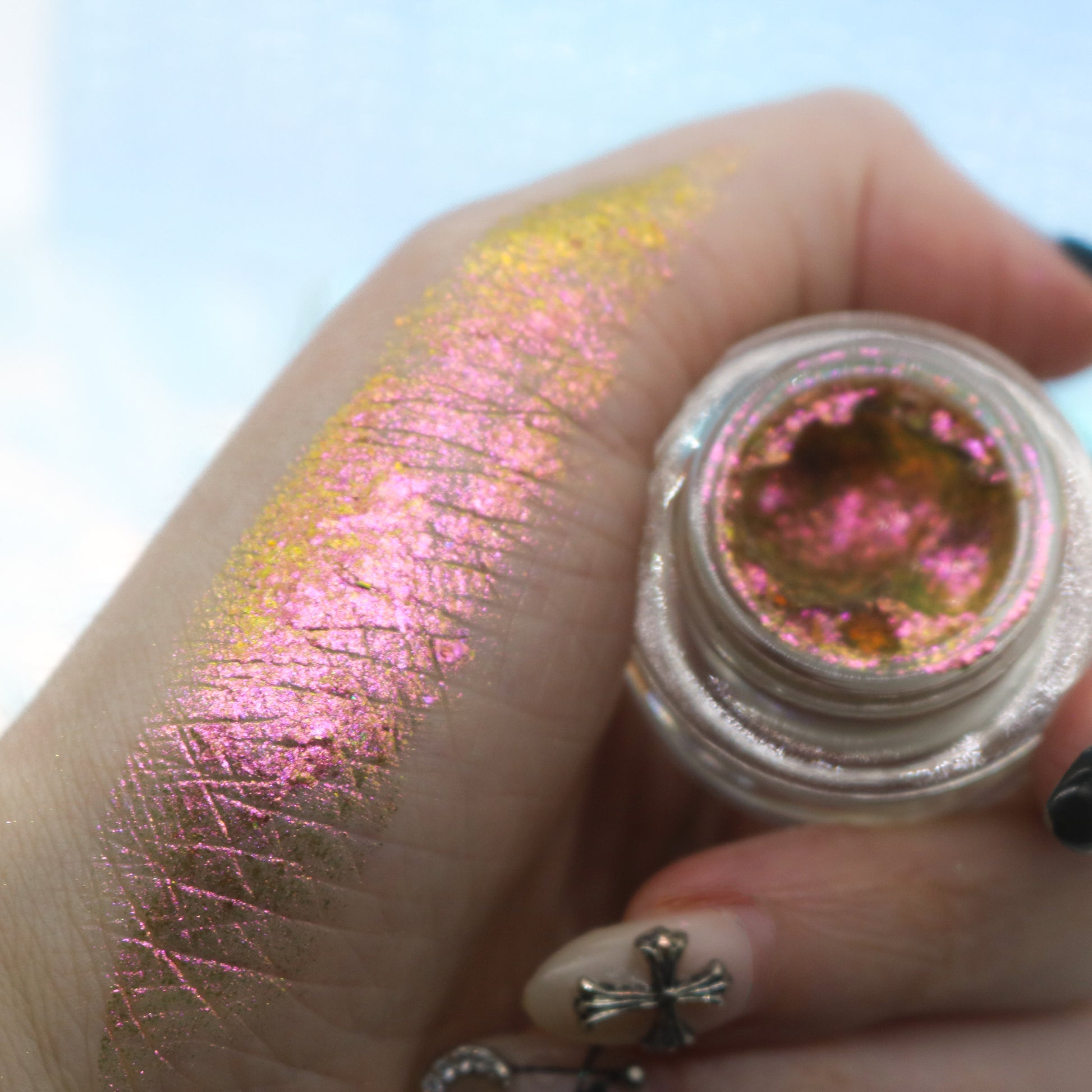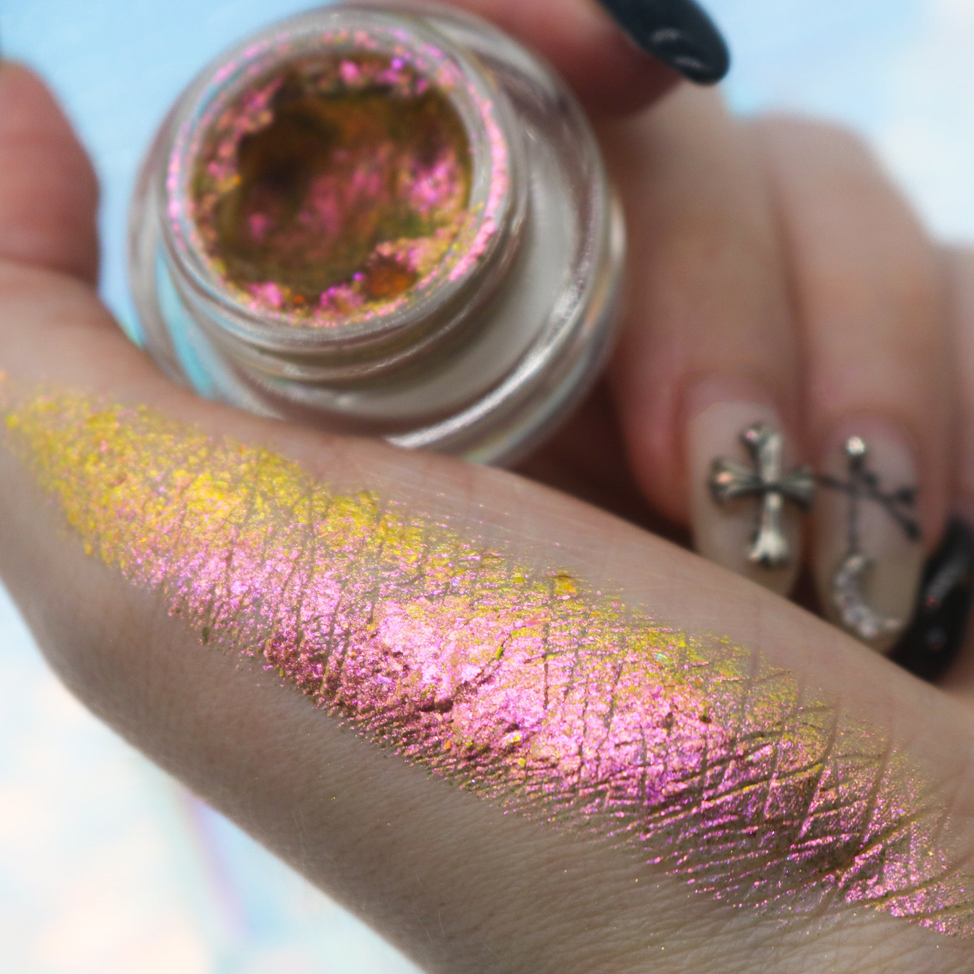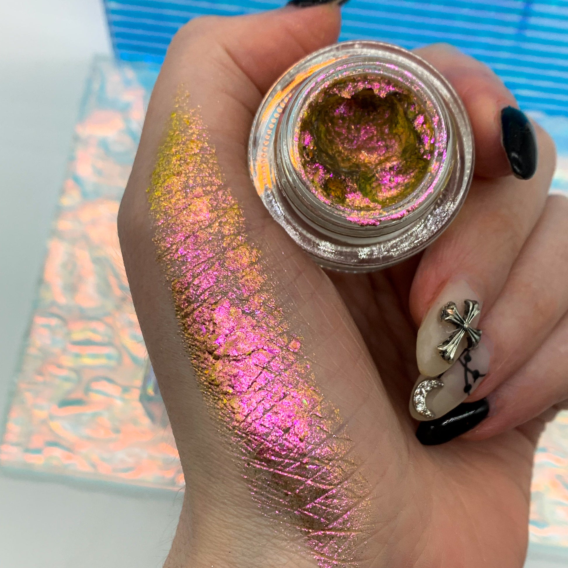 Our Utopian Cream Flakes come in a variety of shades and finishes from opaque to sheer. They are perfect to use as a cream eyeshadow or as a topper product to add a little pop of fun to your eyelook.