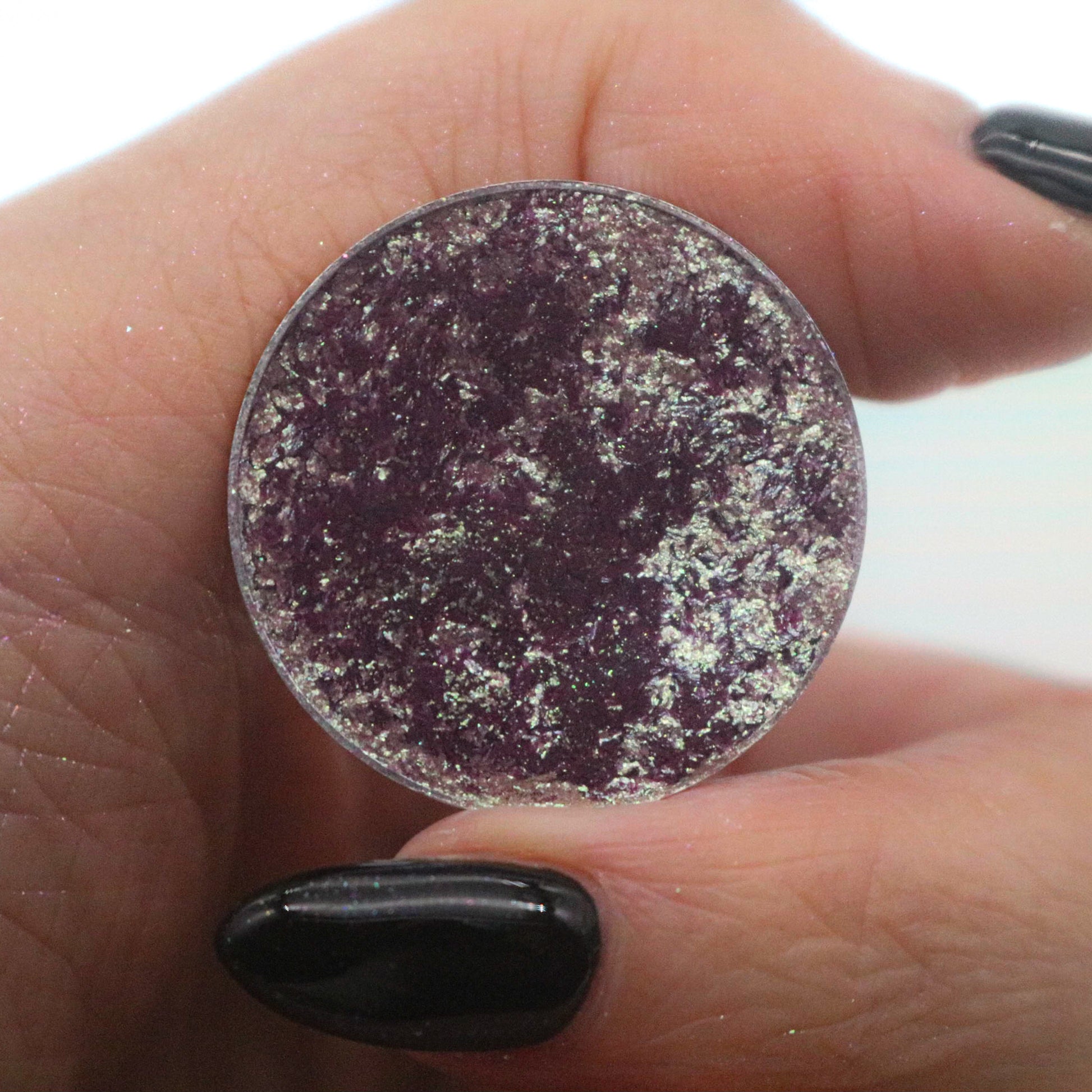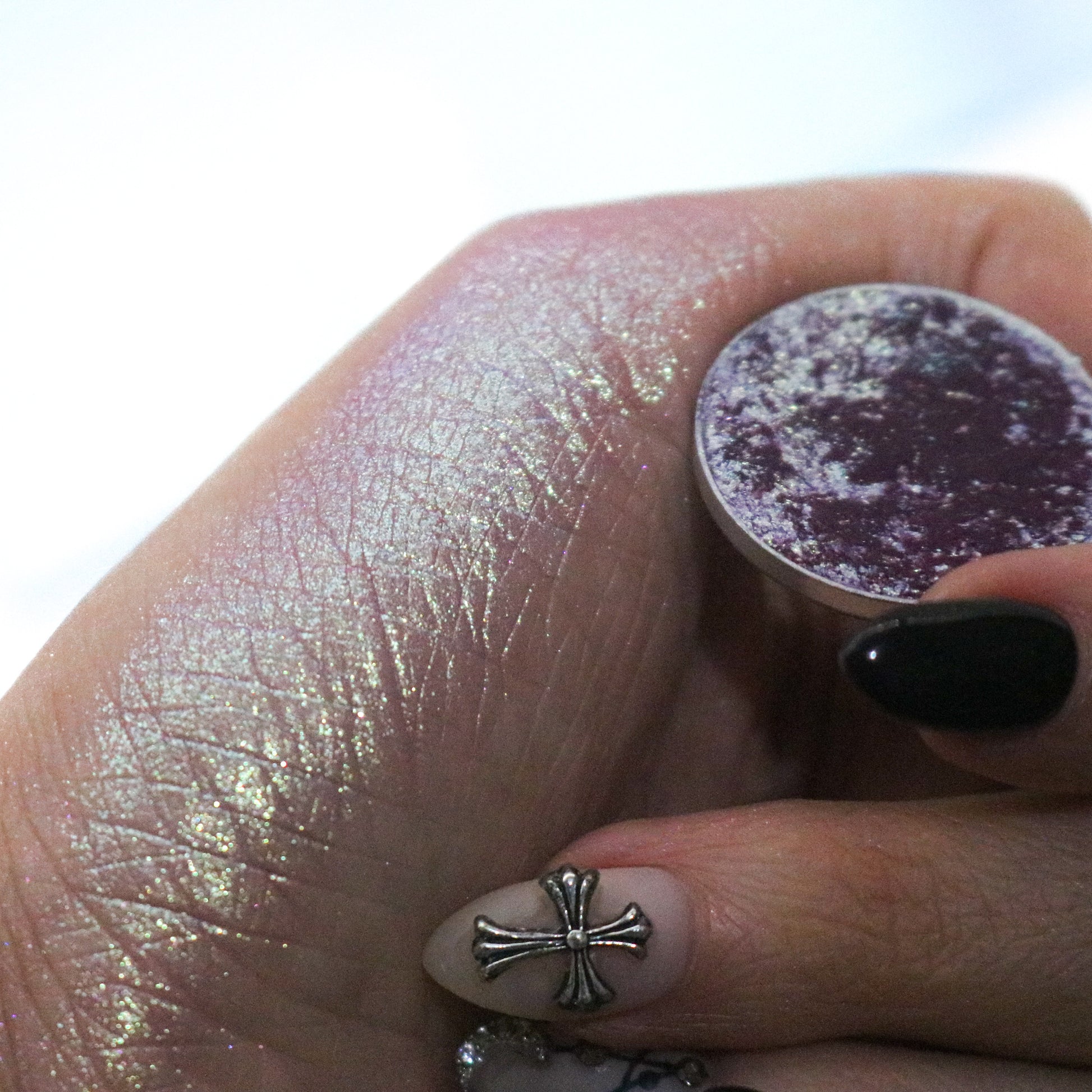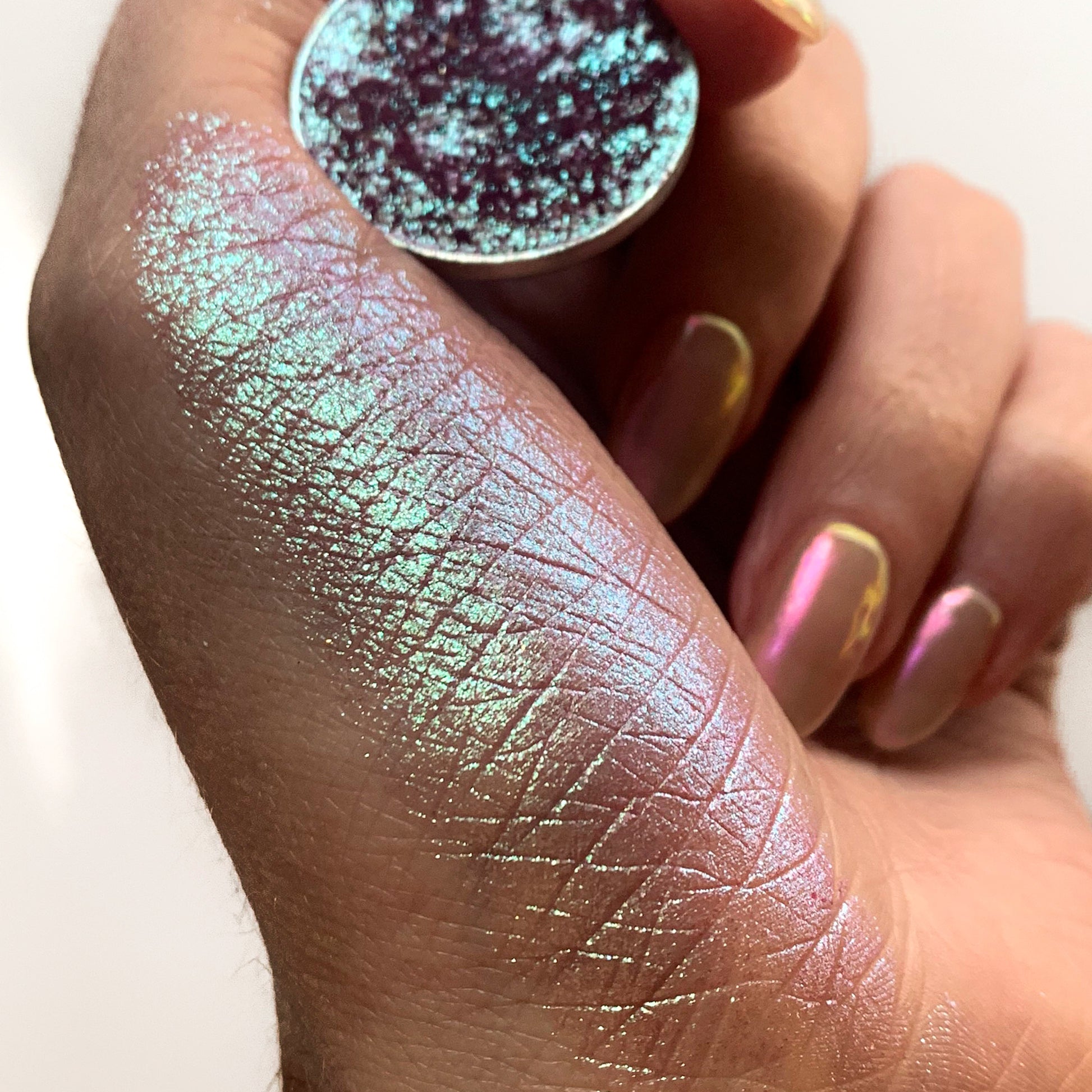 Conjure is a unique, sparkly, shifty shade. In the pan we describe it as an icy purple with hints of frosty mint. Once swatched the purple takes on more of a softer, cranberry undertone and has reflects of mint. This eyeshadow has a sheerer base and would make a great topper!