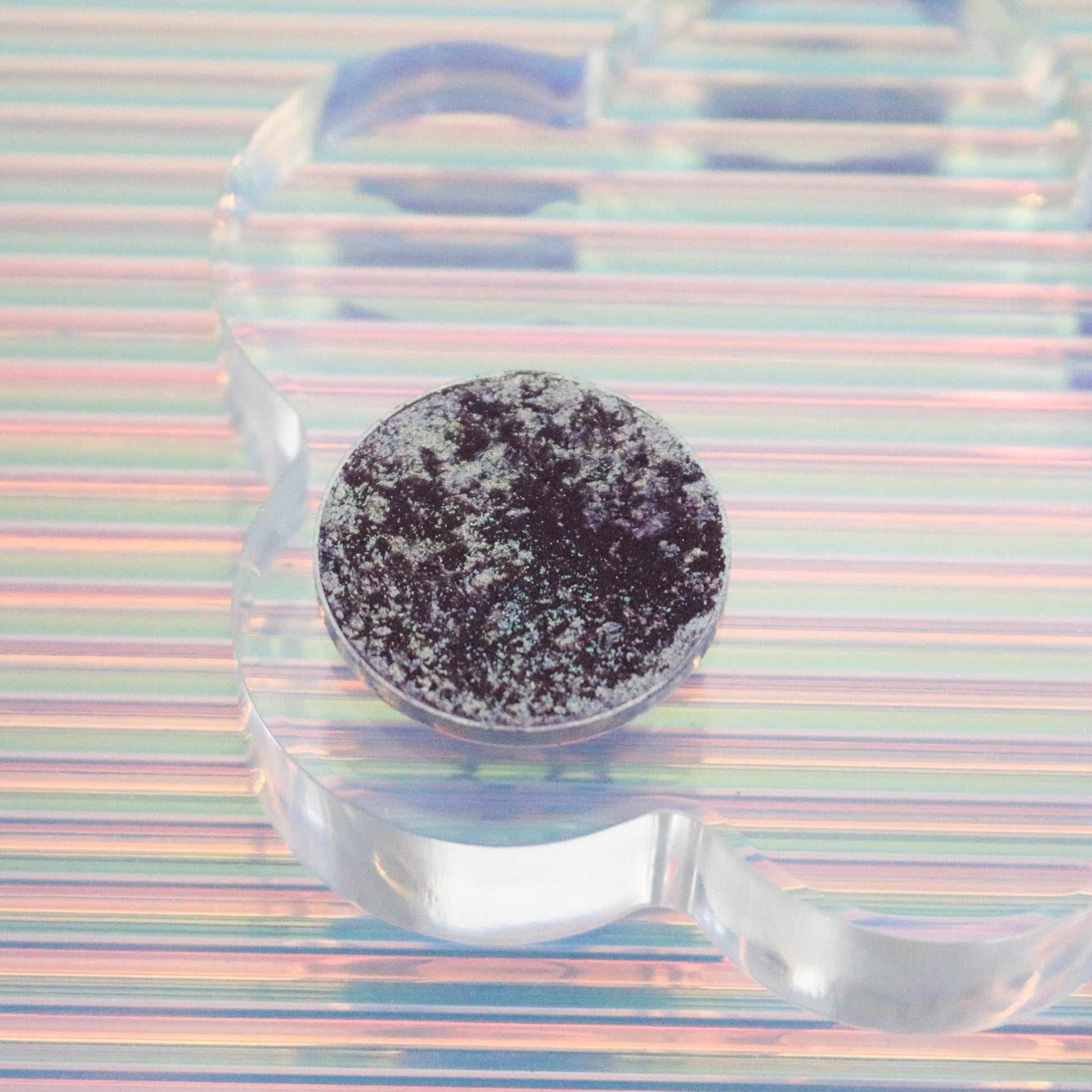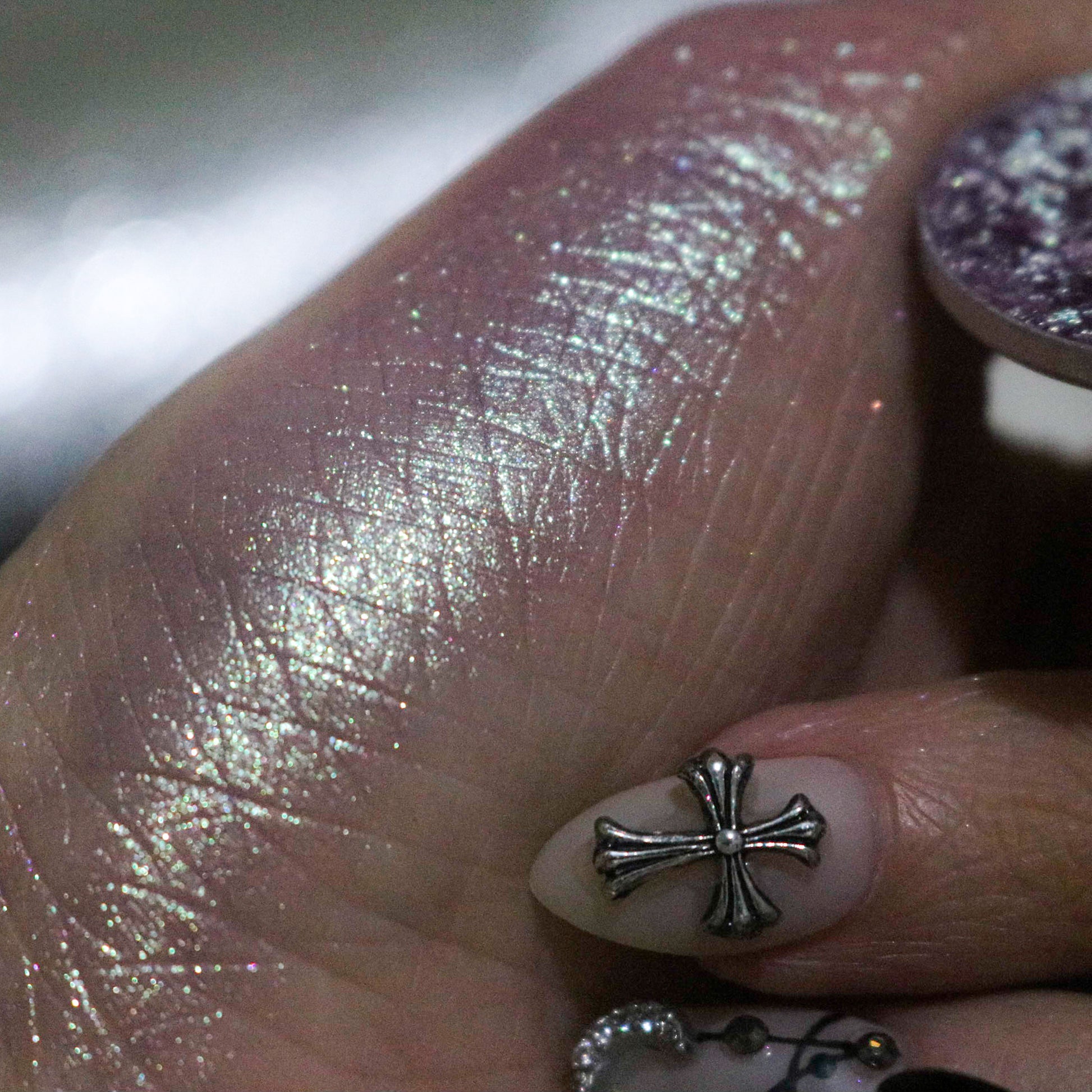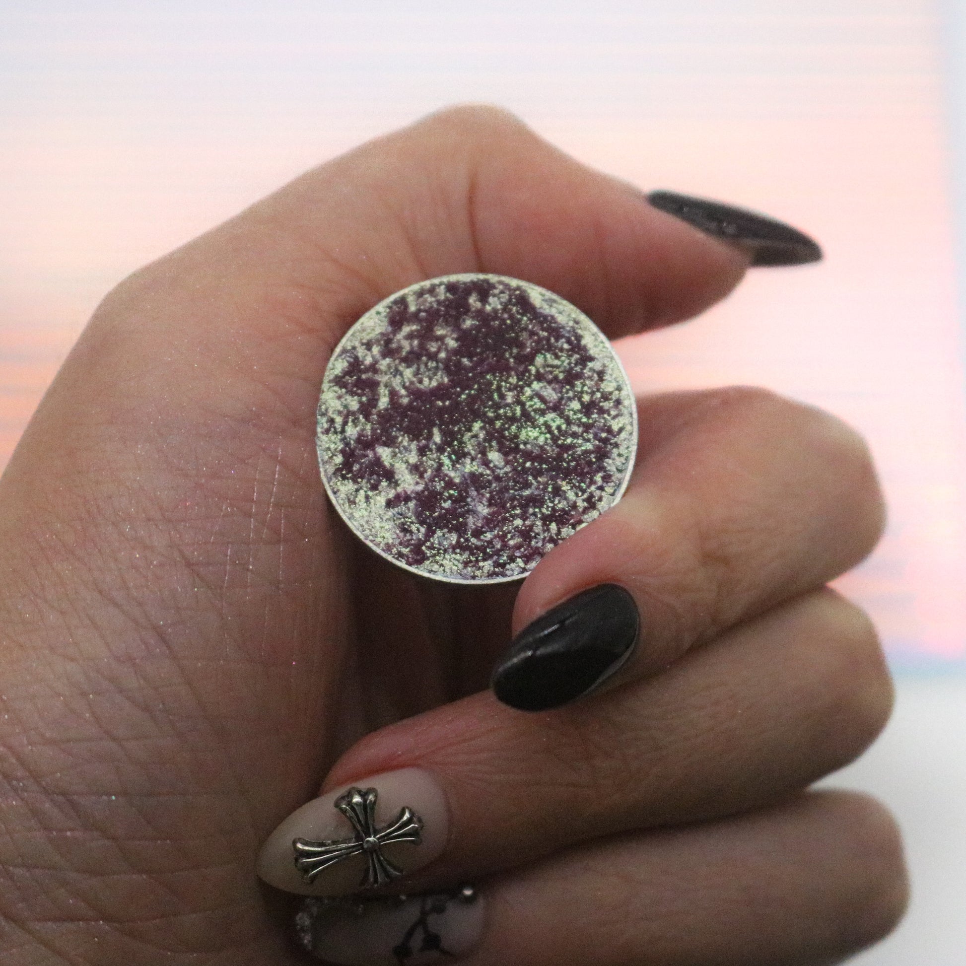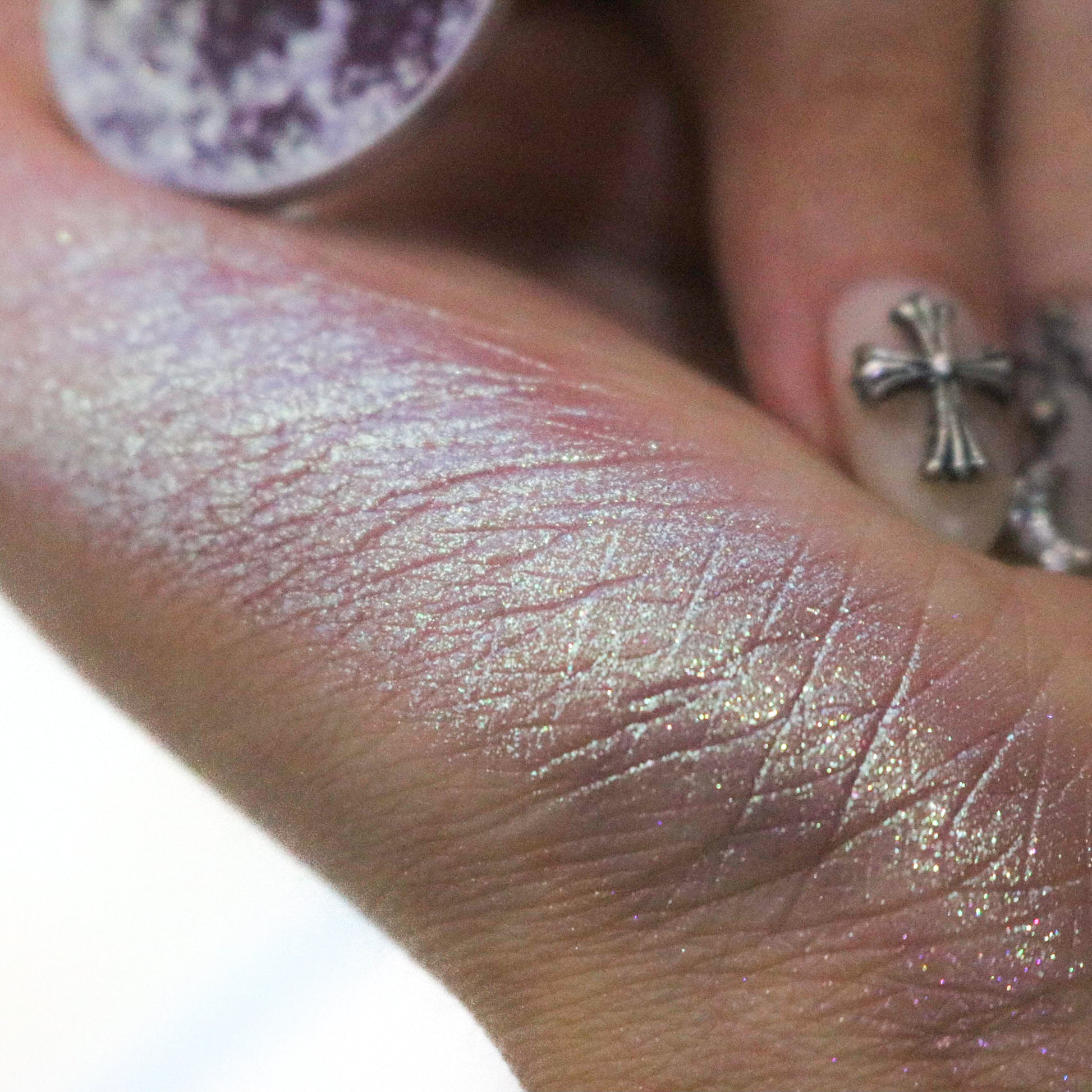 Conjure is a unique, sparkly, shifty shade. In the pan we describe it as an icy purple with hints of frosty mint. Once swatched the purple takes on more of a softer, cranberry undertone and has reflects of mint. This eyeshadow has a sheerer base and would make a great topper!