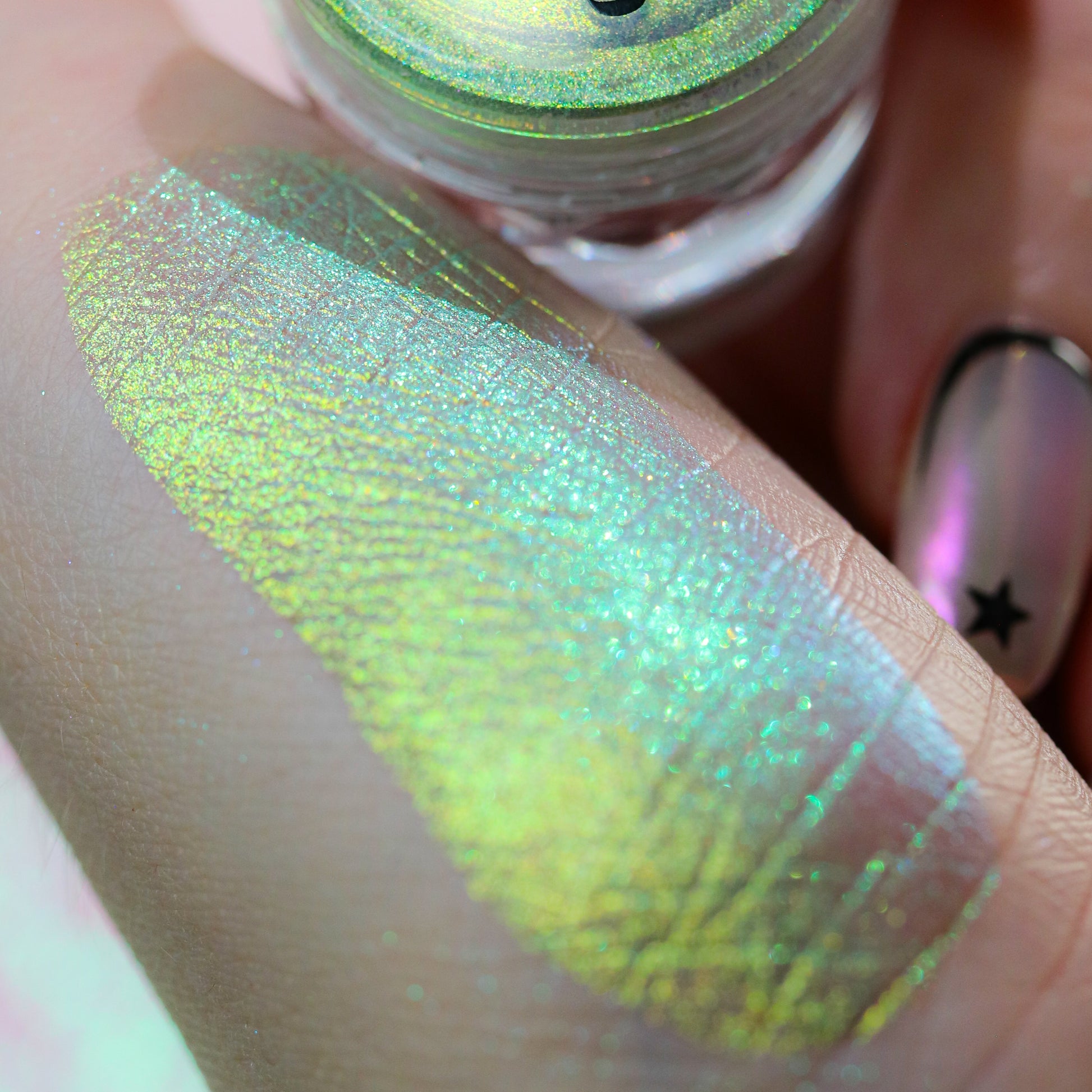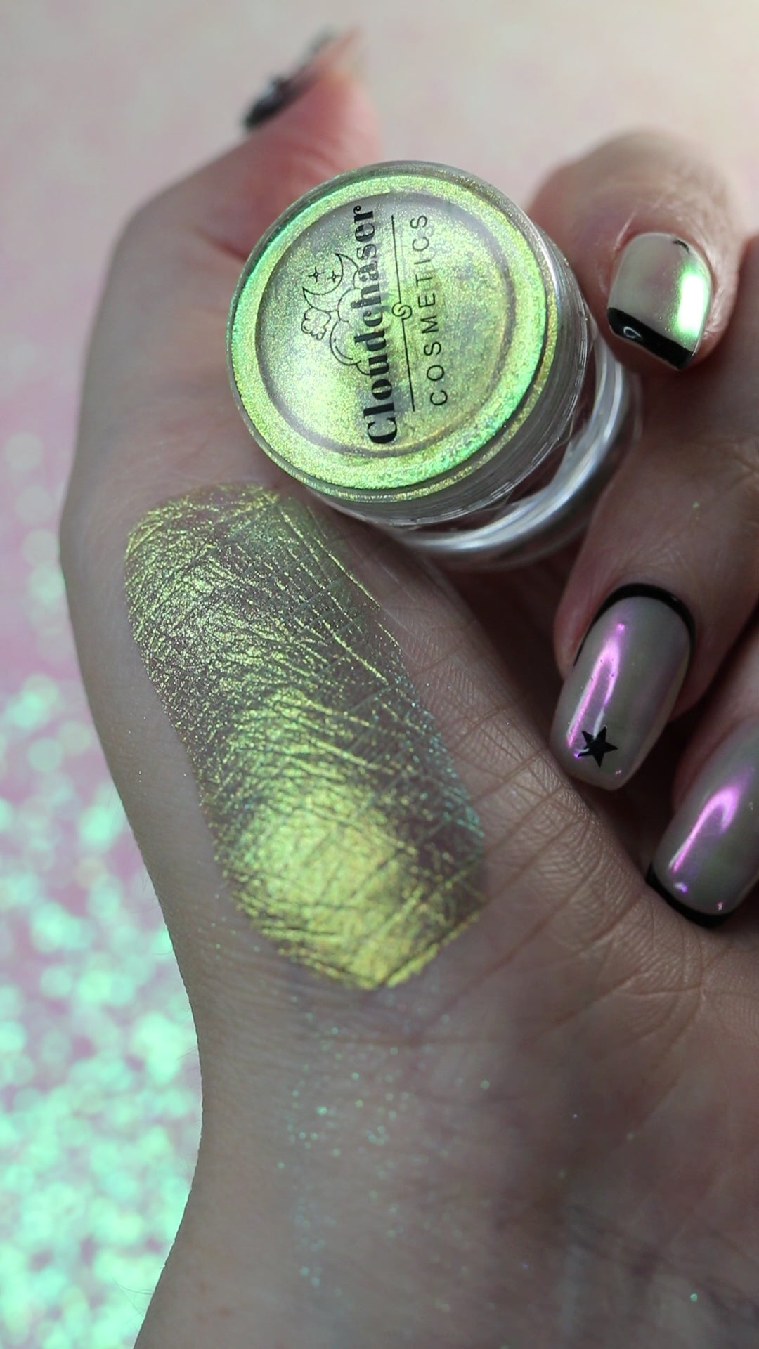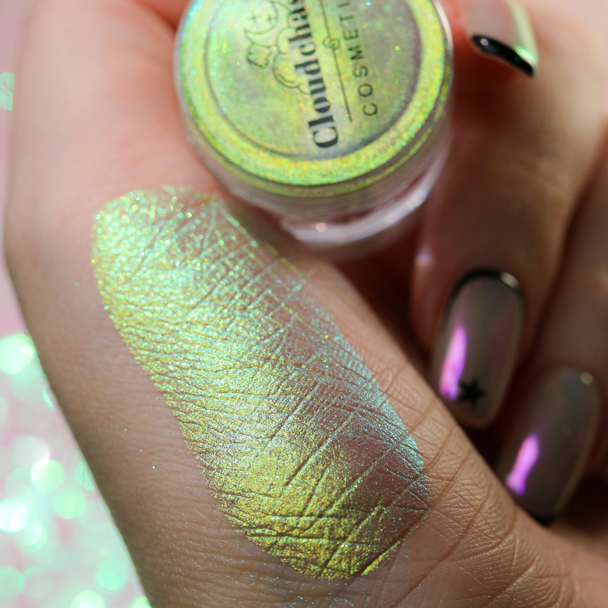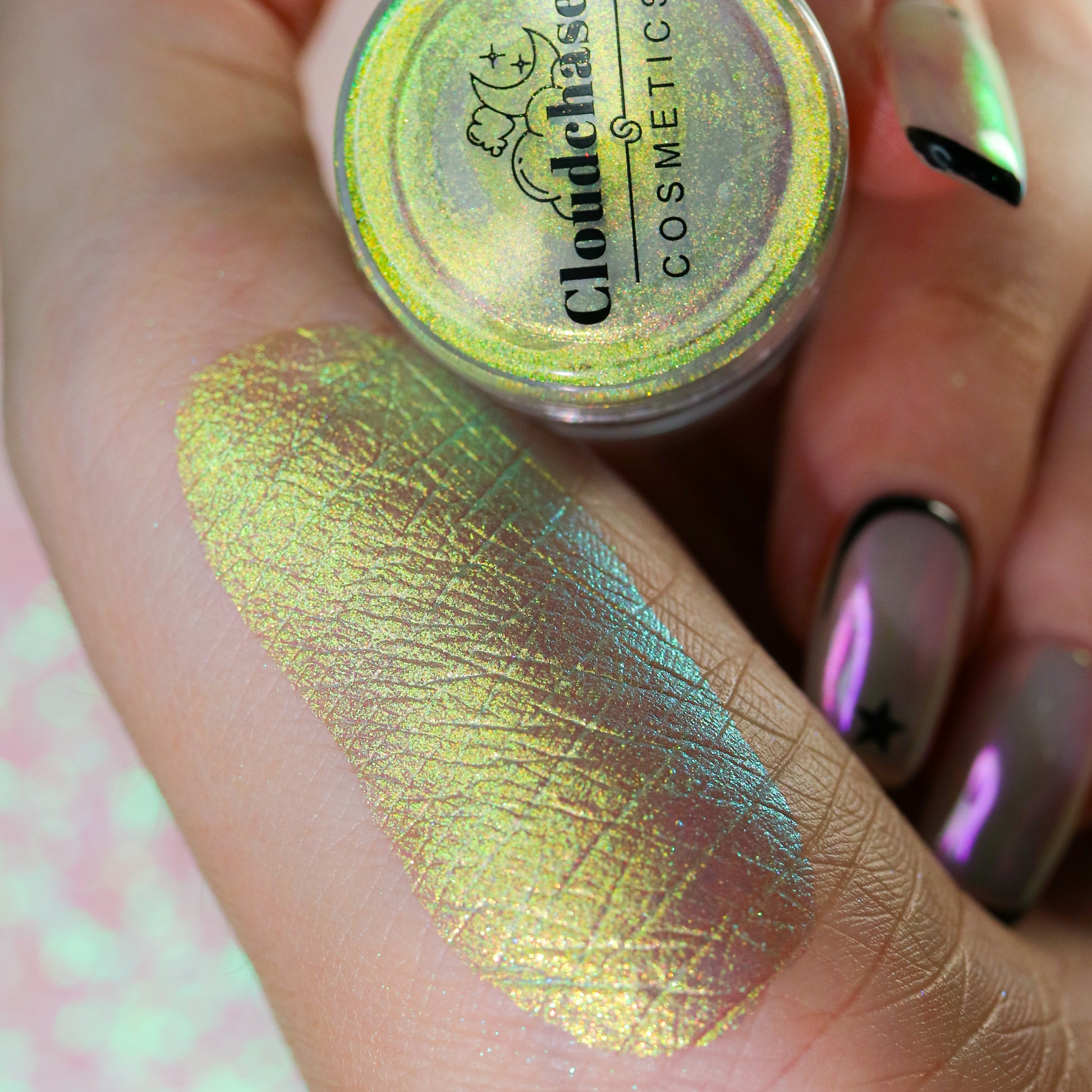 The Ominous Ostara Collection has a smoother finish & formula when compared to our other Cloud Dust Collections. These shades are shifty, and will look very different depending on the base you lay them over. They can be worn alone or make amazing topper shades. They have a sheerer base that can be worn as such, or built up to a more opaque finish.