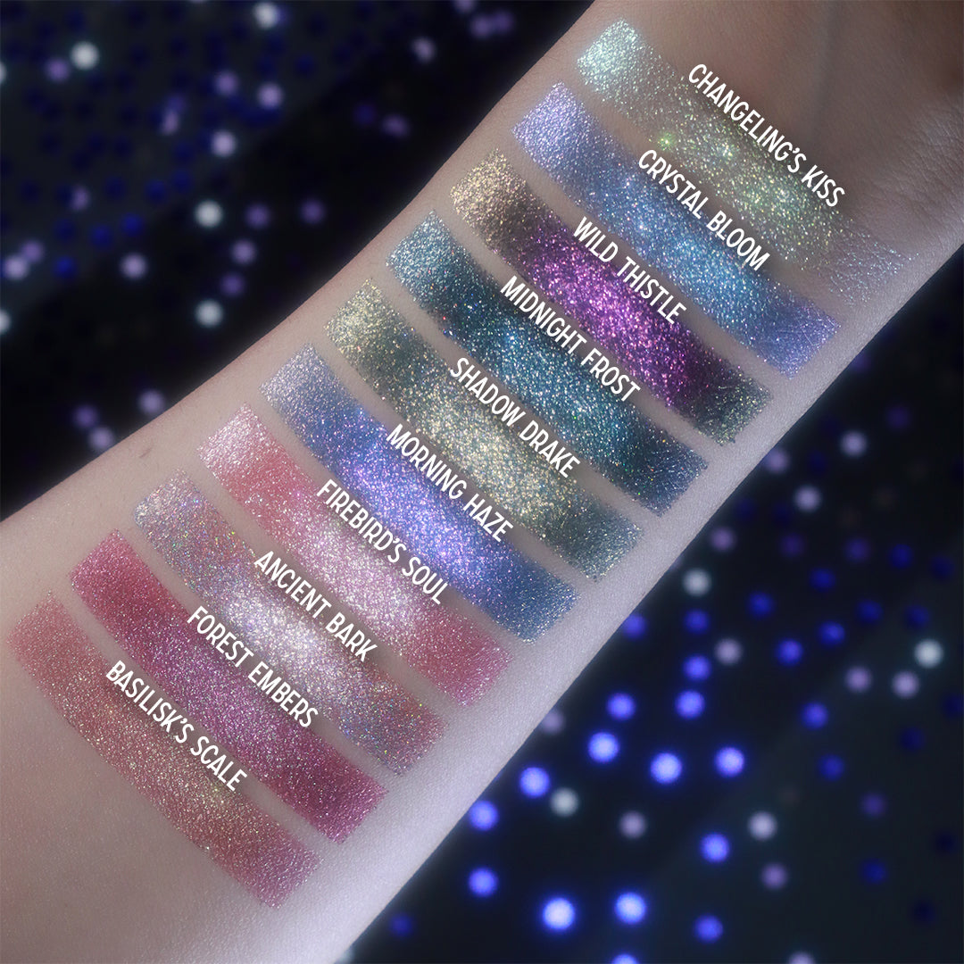 About Texture/Finish: Our Secrets Of The Sylph collection is made up of 10 unique shades all of which have a similar smooth, sparkly, slightly foiled finish. Every pan fuses two colors together, creating mesmerizing blends—some even revealing stunning multichromatic shift.