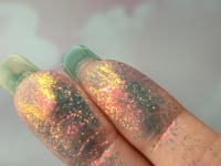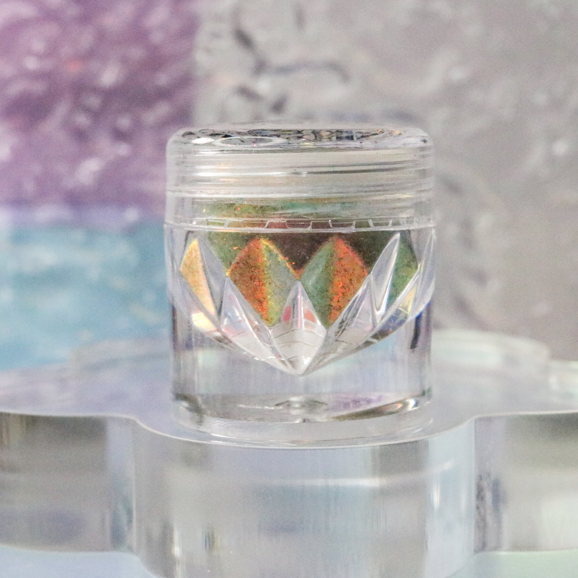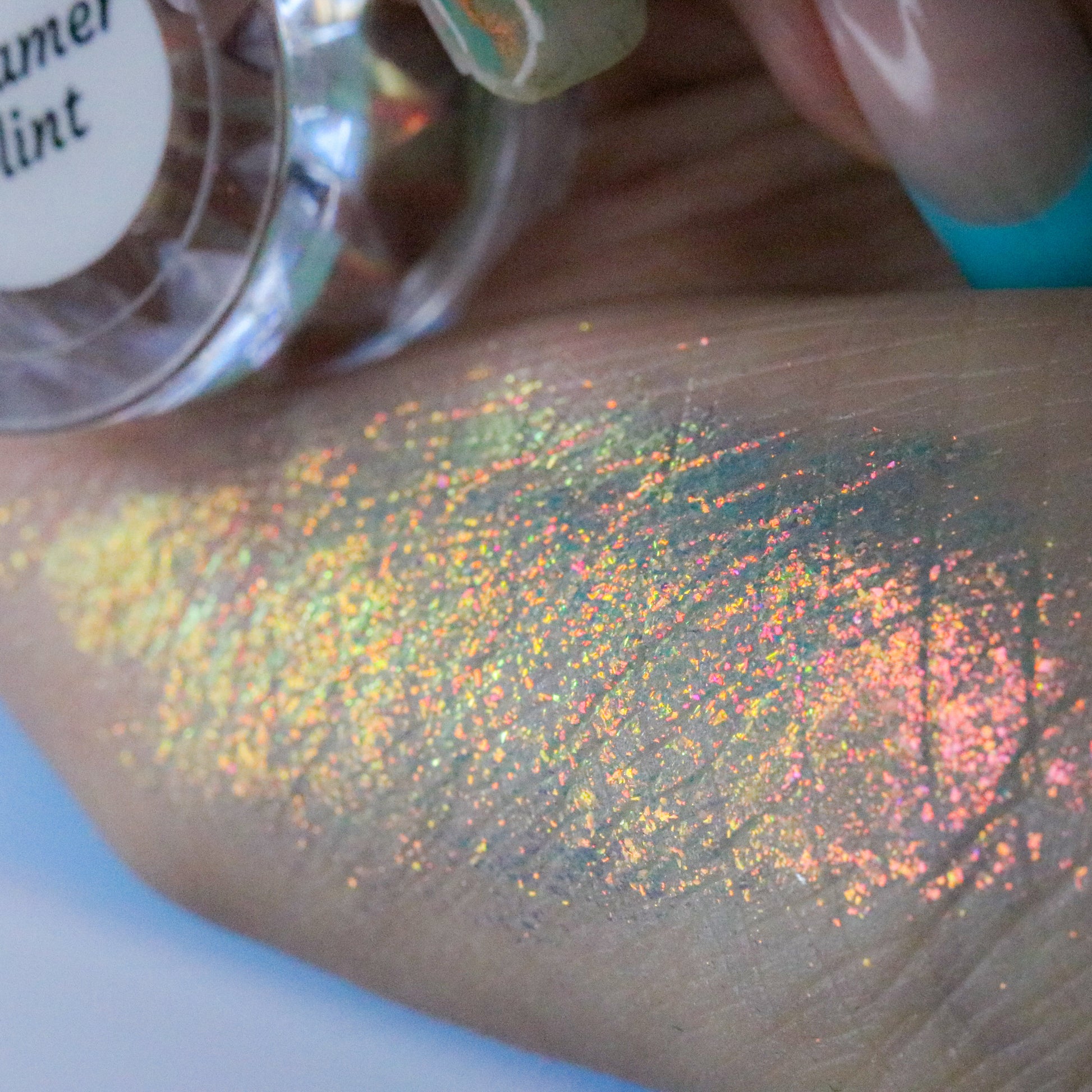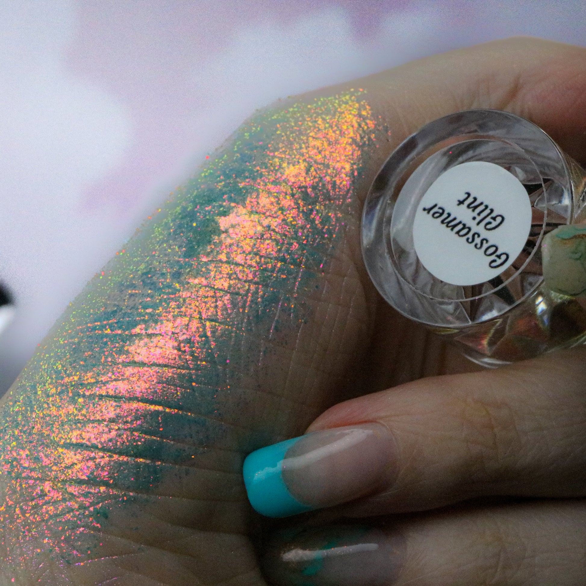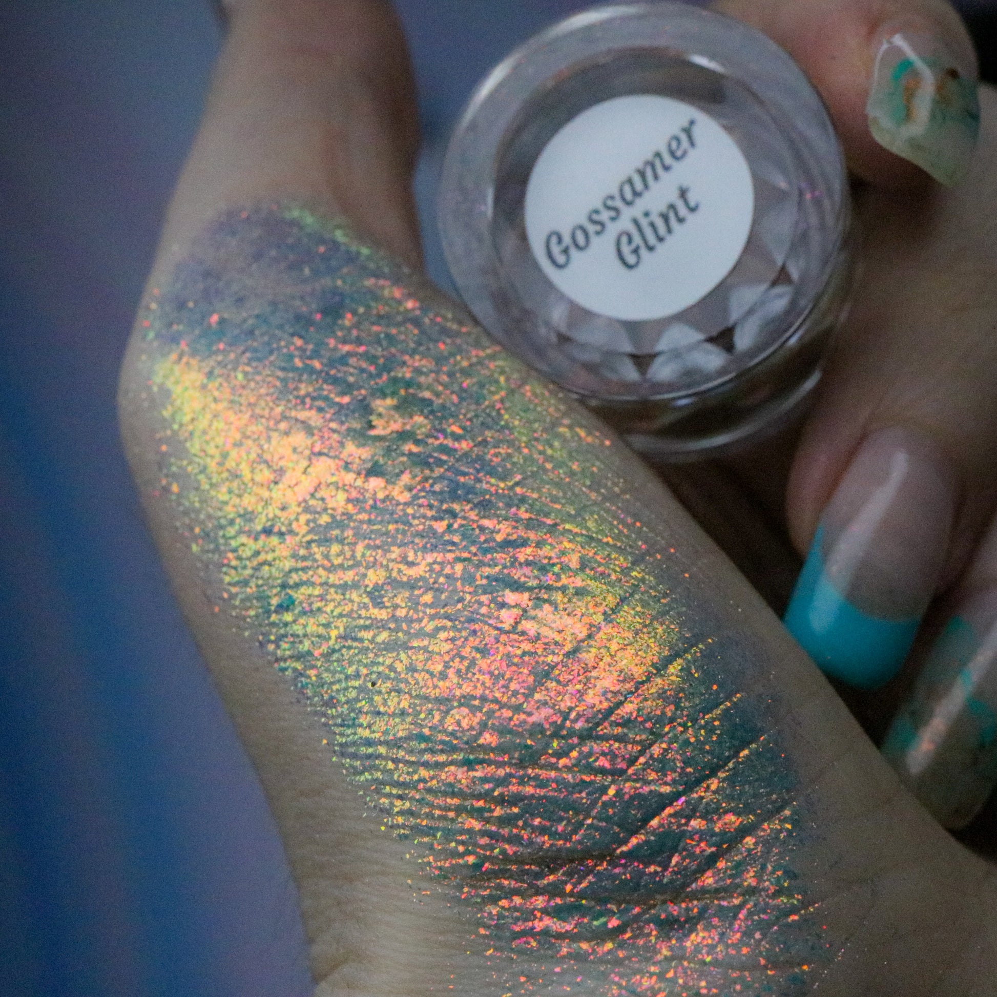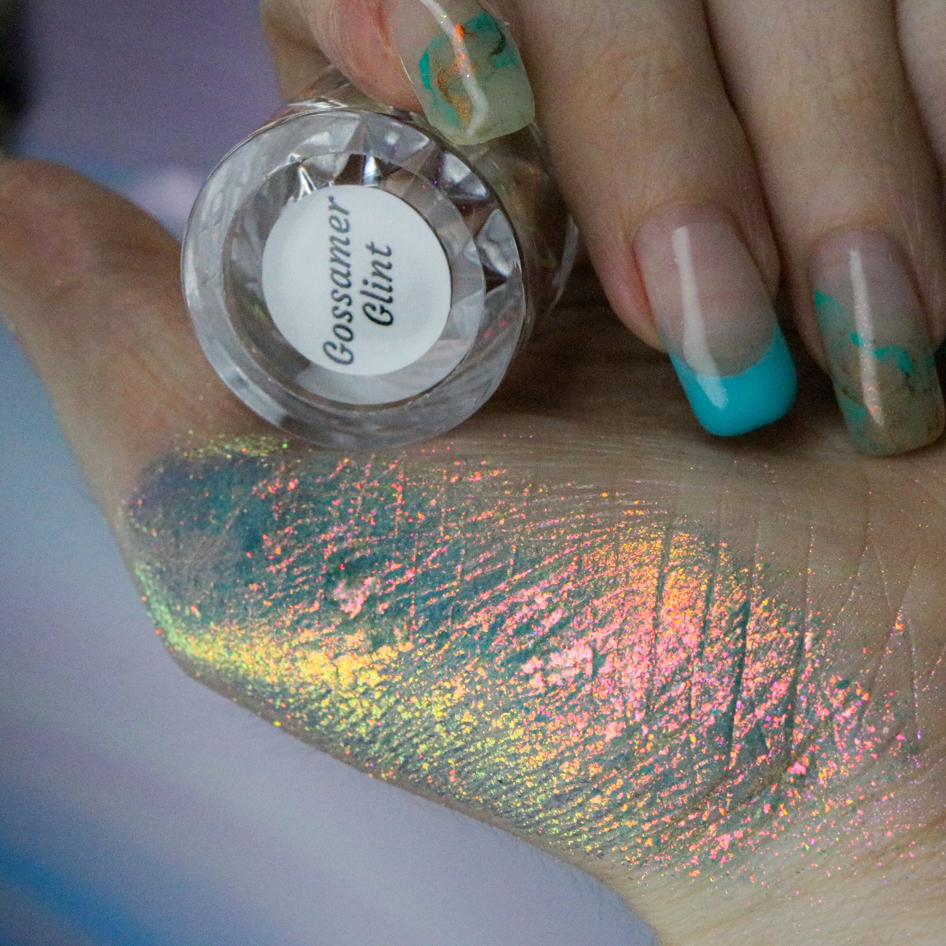 Gossamer Glint, a magical multichrome pigment that will leave you spellbound with its mesmerizing array of hues. This warm-toned pigment boasts a beautiful base of green and yellow, with stunning shifts of yellow, peachy pinkish red, green, and aqua that create a truly ethereal effect.