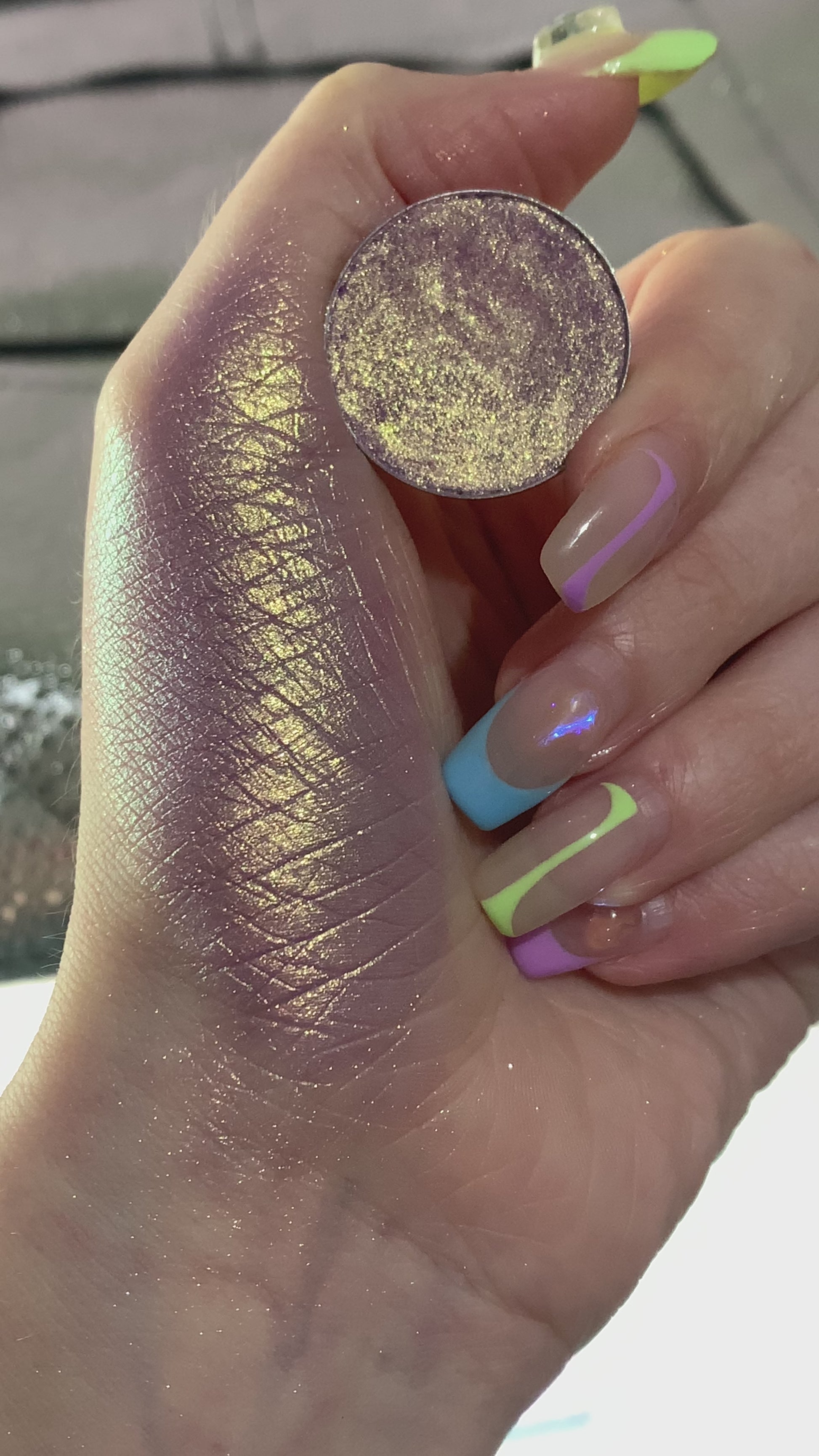 Harpy, a truly distinctive shade that combines a stunning smokey mauve undertone with striking golden shifts. Prepare to be enchanted by its unique charm, as it reveals subtle hints of berry within its base. One of our personal faves!