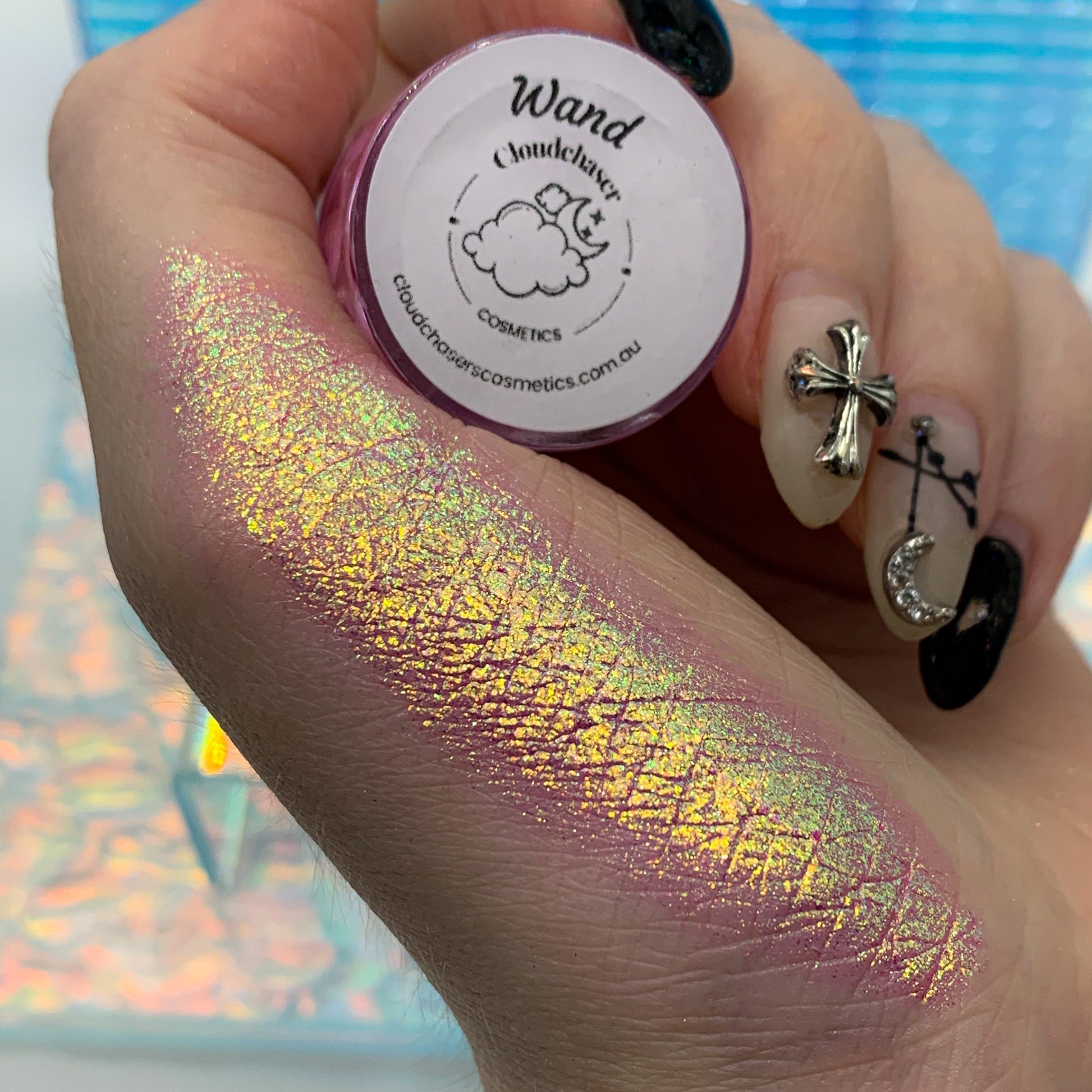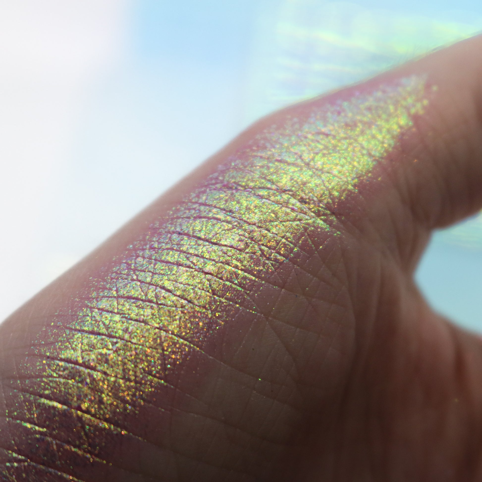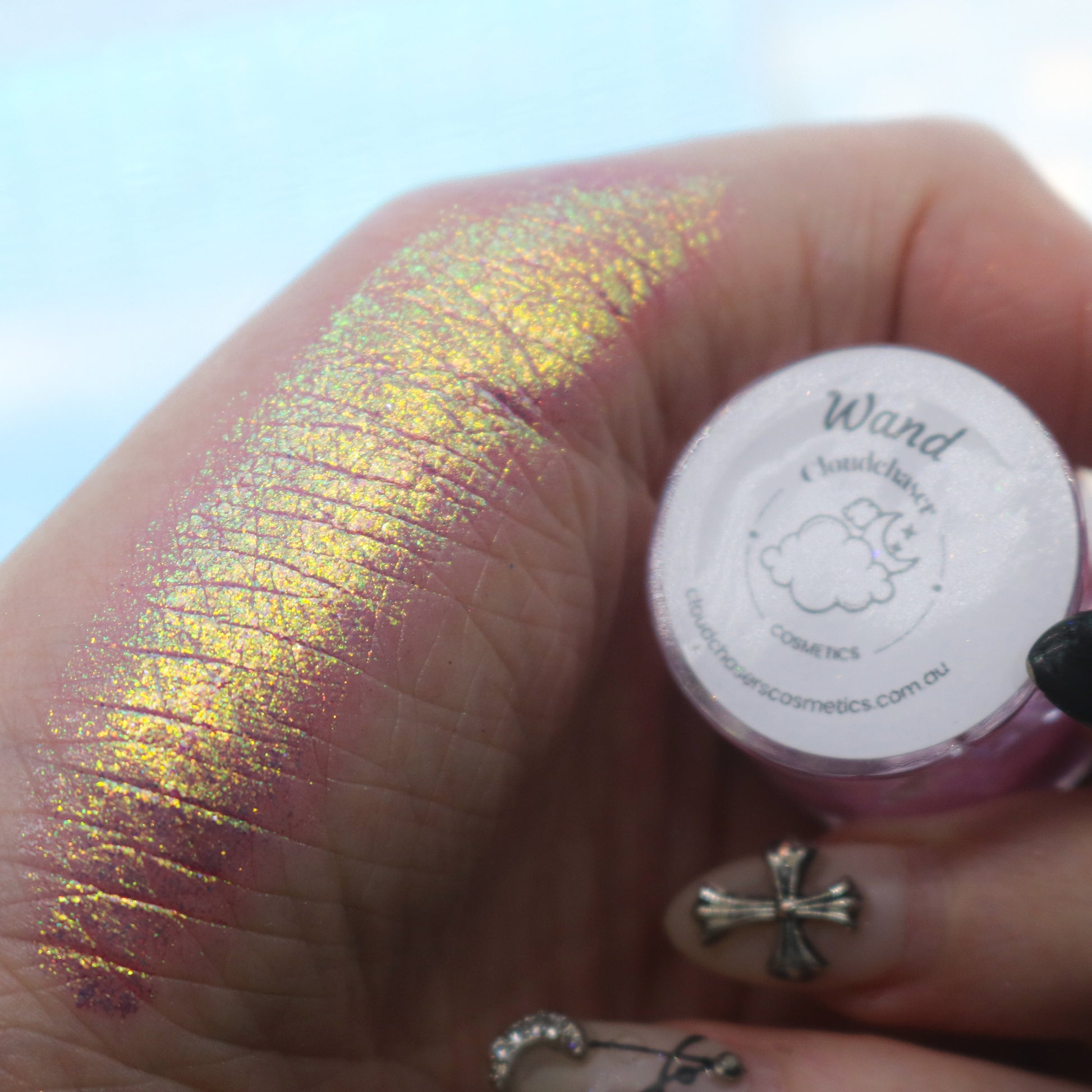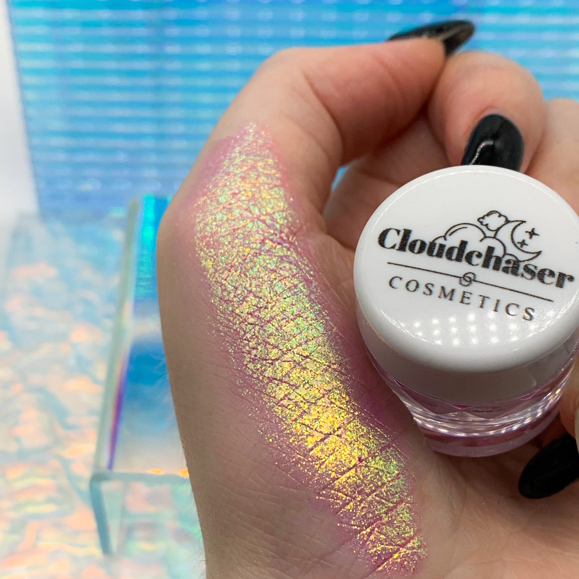 Turn your look into a fairy tale when you wear our Cloud Dust Loose Pigment in Wand. A beautiful pearly pink base with gorgeous shifts of golden yellow and green.