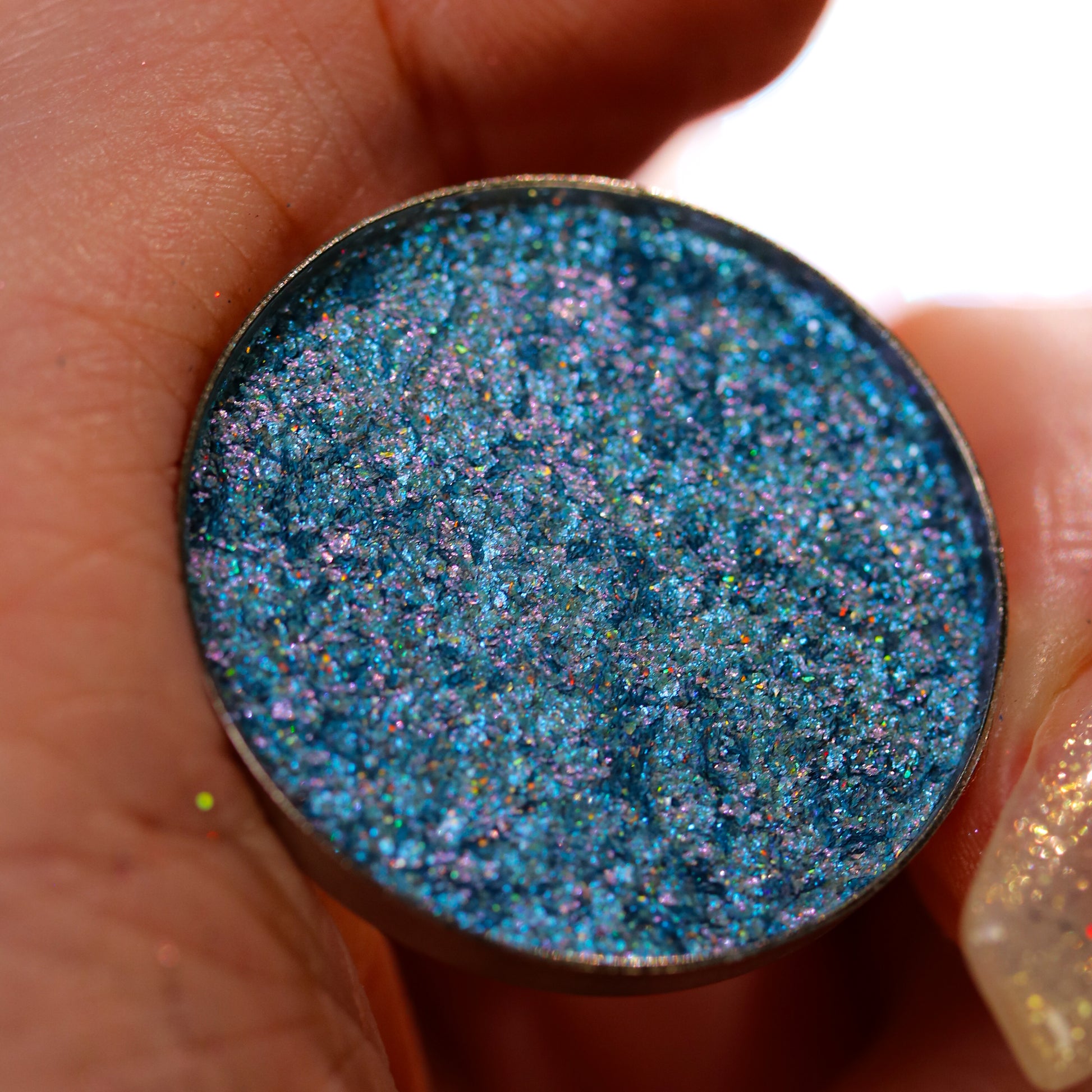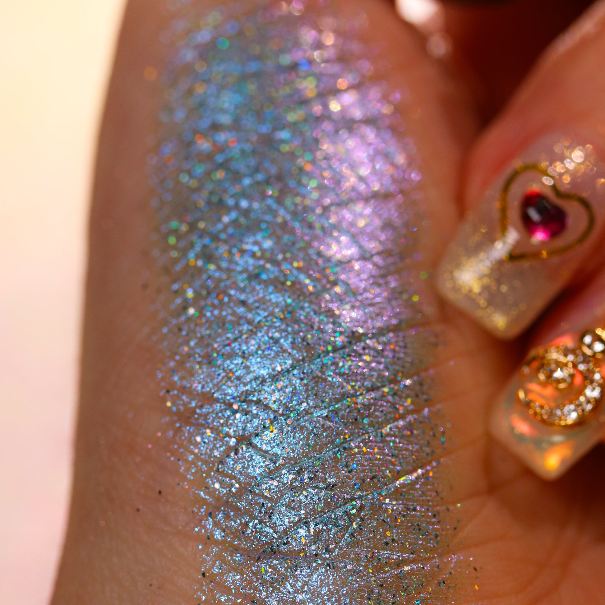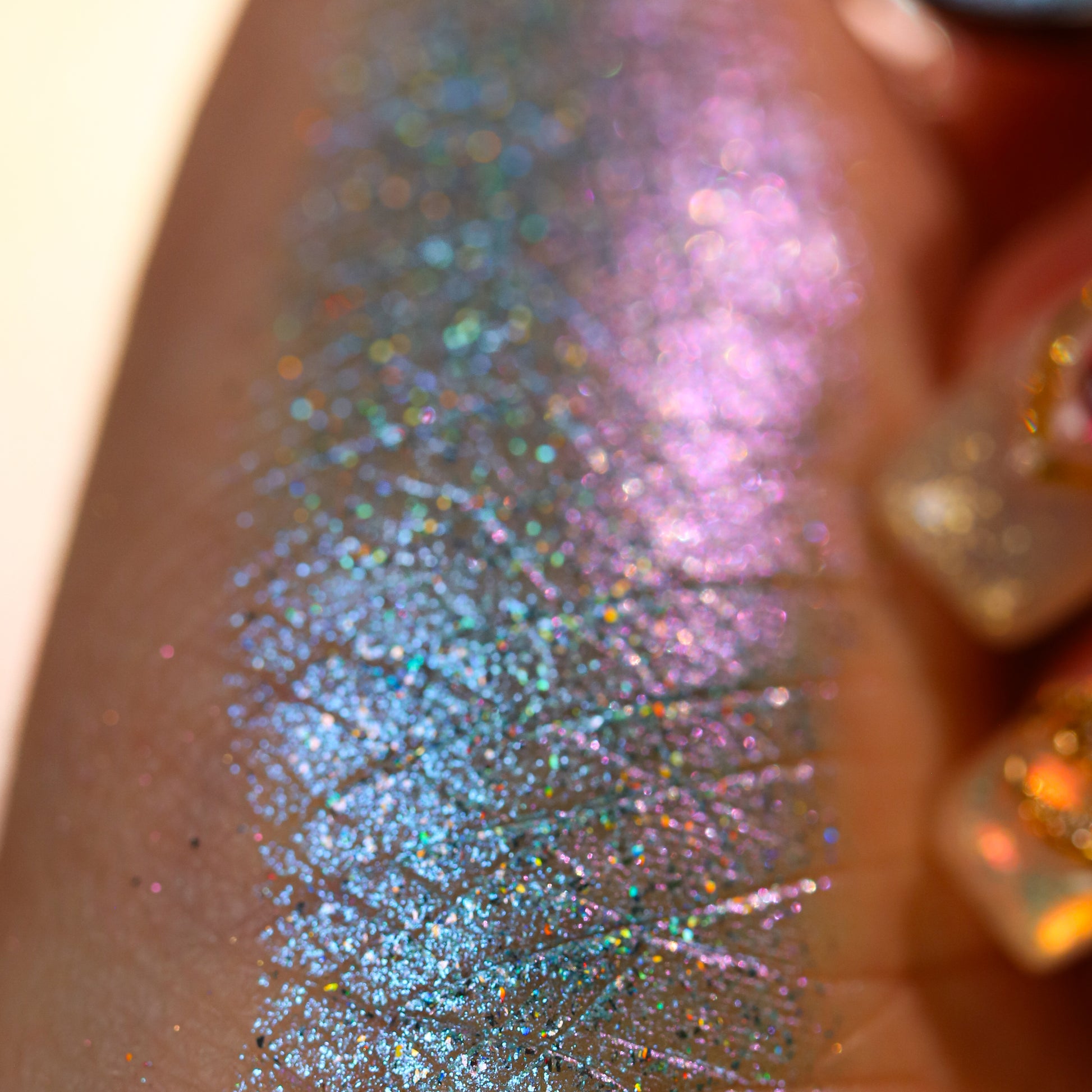 About Texture/Finish: Glacial Aura is a pressed holochrome with a smoother, slightly squishy formula. This shade has a semi transparent finish that is highly reflective. The texture is soft and squishier with alot of glide and slip.
