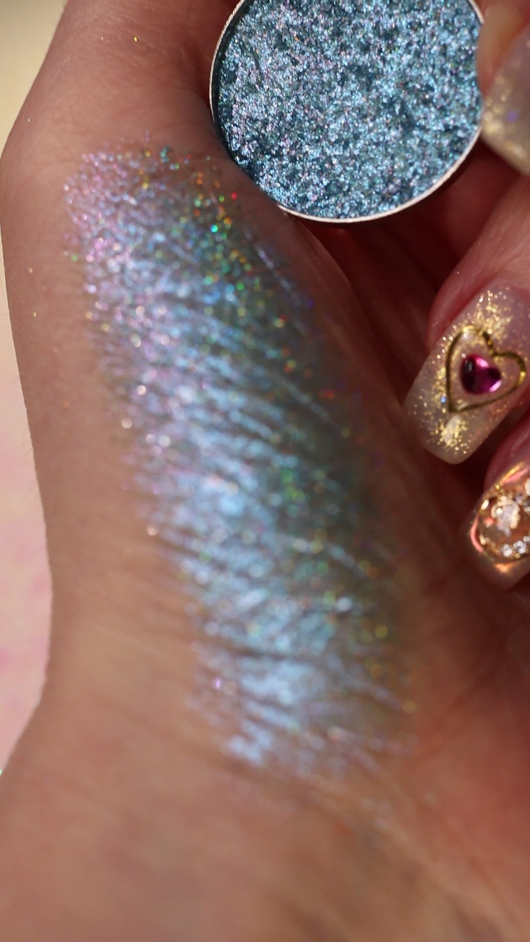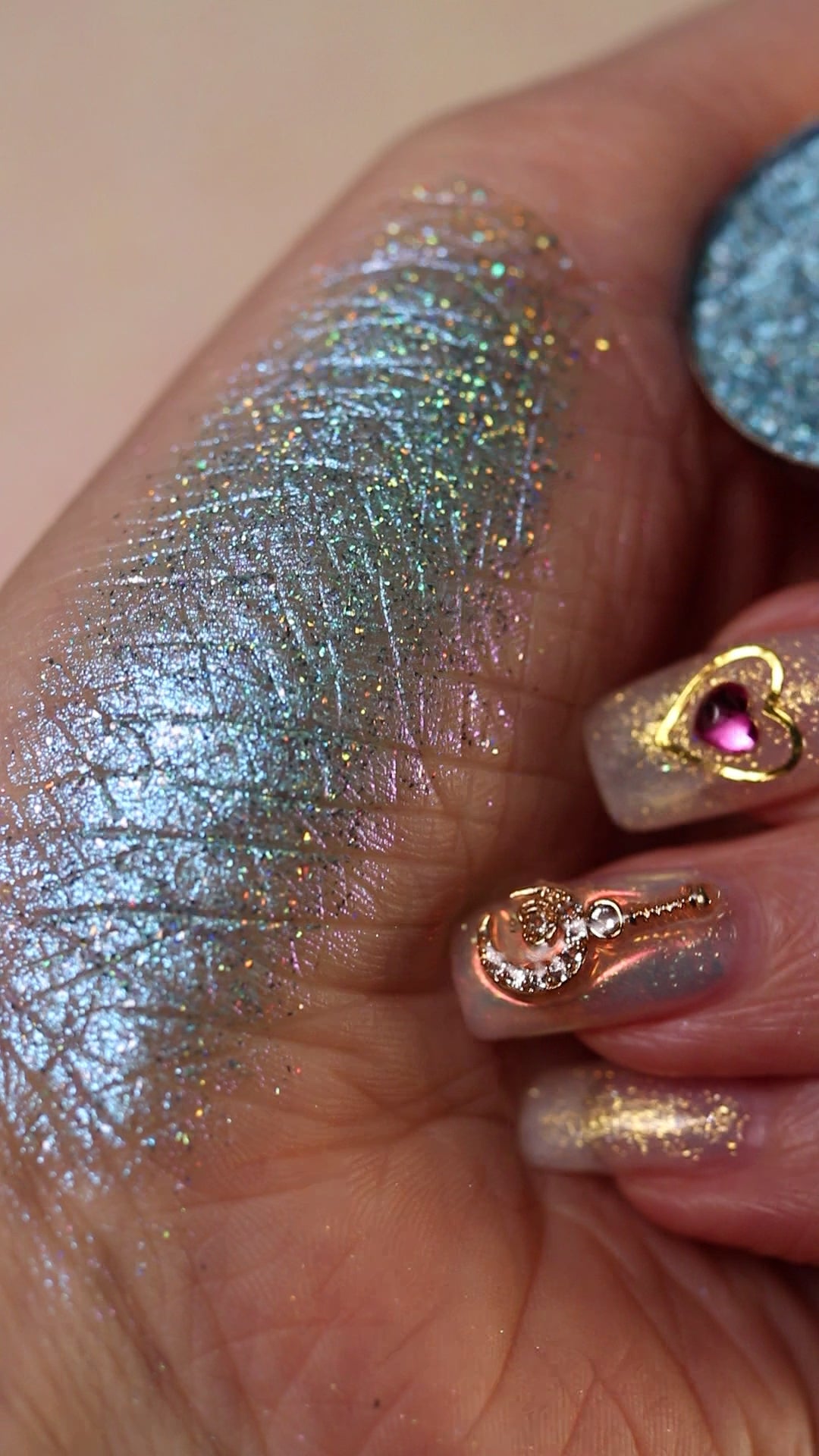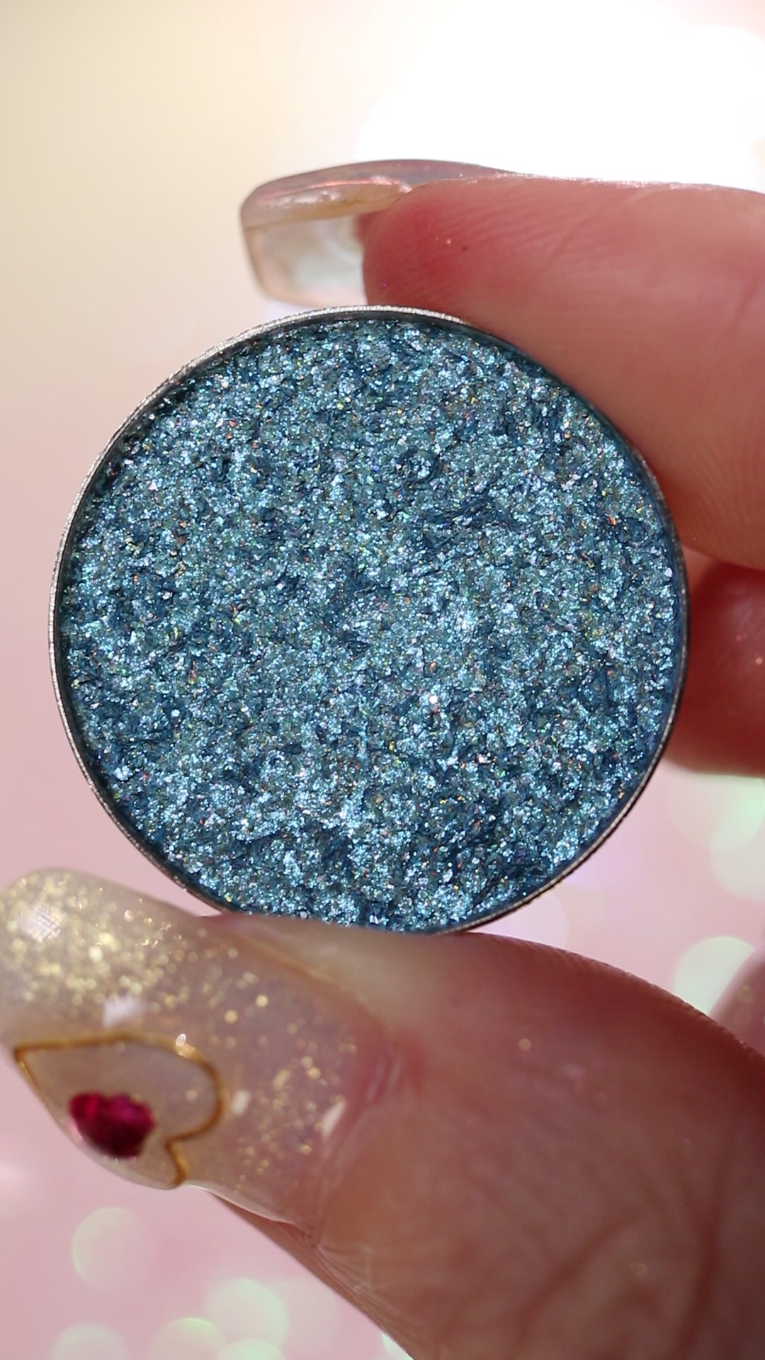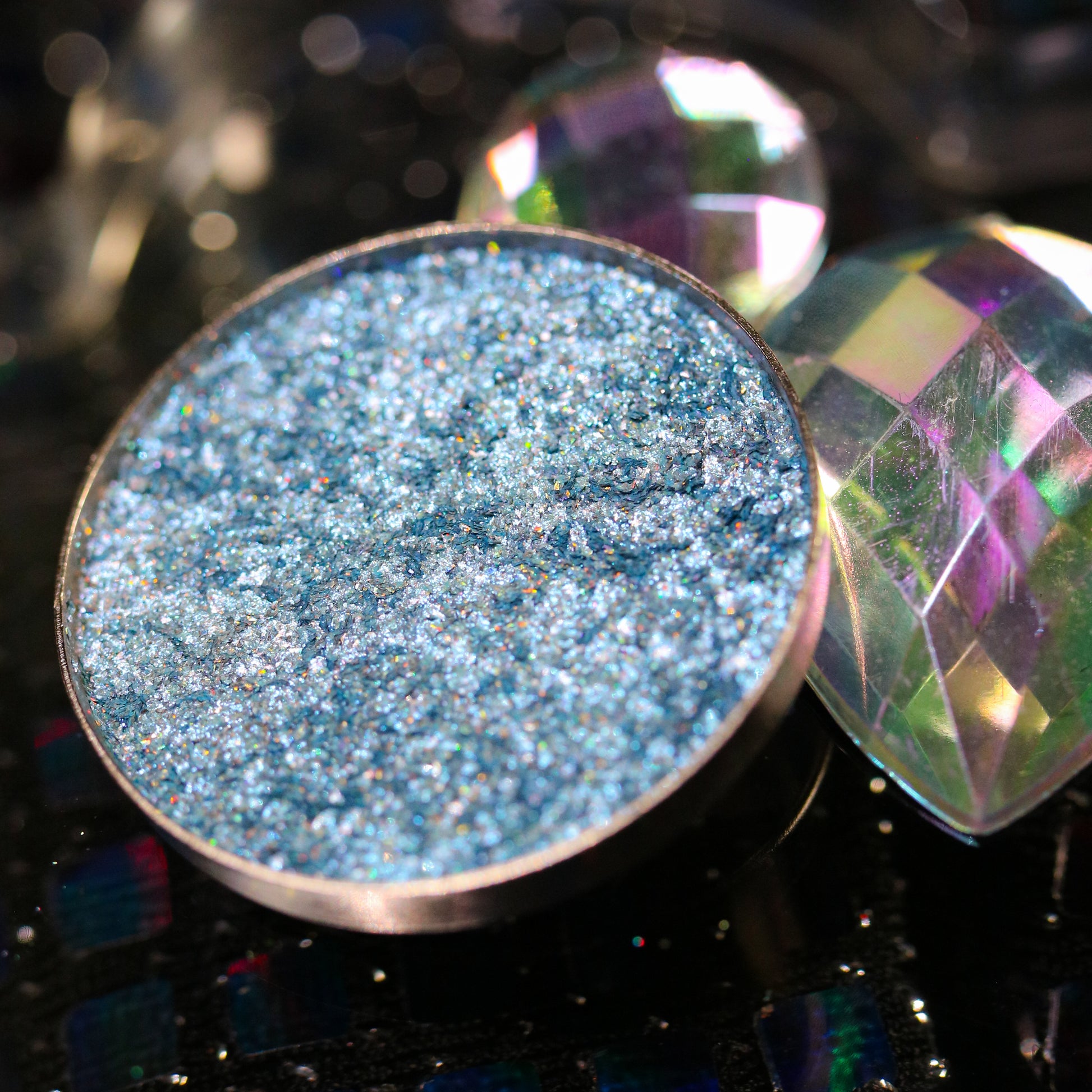 About Texture/Finish: Glacial Aura is a pressed holochrome with a smoother, slightly squishy formula. This shade has a semi transparent finish that is highly reflective. The texture is soft and squishier with alot of glide and slip.